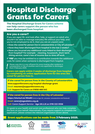 To qualify, the cared for person must live in Leicestershire or Leicester city and have been discharged from hospital in the last 2 weeks. The unpaid carer must have incurred costs linked to the discharge from hospital.