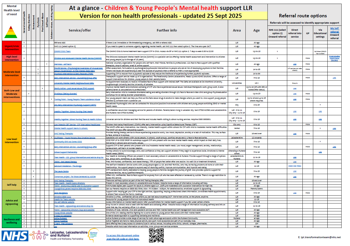 The documents help users to identify appropriate mental health services for a given level of need, gives an overview of the offer, and importantly information on how to access each service. They can be printed on landscape A3.