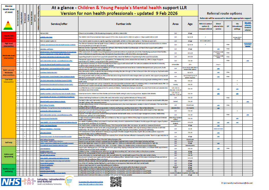 Our ‘At a Glance’ documents show all NHS commissioned mental health services for children and adults across Leicester, Leicestershire and Rutland.