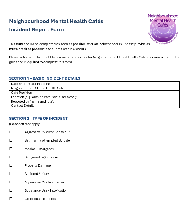 Please refer to the Incident Management Framework for Neighbourhood Mental Health Cafés document for further guidance if required to complete this form.